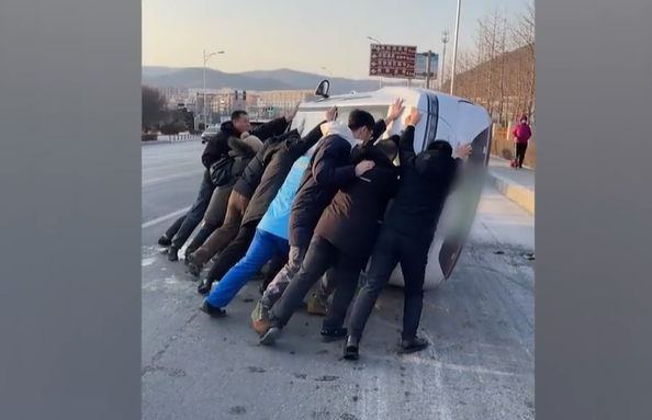 化险 十几名热心市民合力救援 无奈,几人拼尽全力,重近两吨的车辆依然纹丝不动。这时,杜德龙凭借年轻体力好的优势,踩着轿车底盘爬上了车,他想着拽开车门,让司乘人员先爬出来。结果发现车门上锁,无法从外部打开。就在大家一筹莫展之时,越来越多的热心市民围了过来,大家商量着再次推车试试。“你们都没事哈,没事的话我们就推车了。”荆裕明等人再次向车内司乘人员确定他们的状况。“没事没事,都没事,推吧。”车内人员回应道。随后,十几名热心市民紧紧围住车顶等三面,二十余只手或推车顶或扶车身。 荆裕明眼看着人手富裕了,他决定掏出手机拍照录像。“路过的市民有男有女,有年长的,有年轻的,大家都纷纷伸出援手,热心帮忙,彰显了大连市民助人为乐的传统美德。我正好做一个记录者,将他们记录下来。”他说。“一、二、来!”“一、二、来!”十几名热心市民喊着号子开始发力,车辆被缓缓推动。“再来一下!”“慢点,慢点……”车辆“啪”的一下落了地。